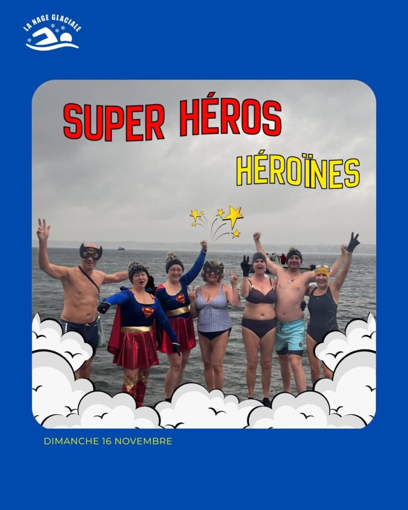 Pour ce 7ème entraînement le thème « super-héros et super-héroïnes » avait été choisi fort à propos. En effet c’est sous une pluie battante et continue que vous avez été plus de 70 à vous jeter à l’eau. Vous avez été héroïques et le Comité vous remercie pour votre présence et vos sourires.